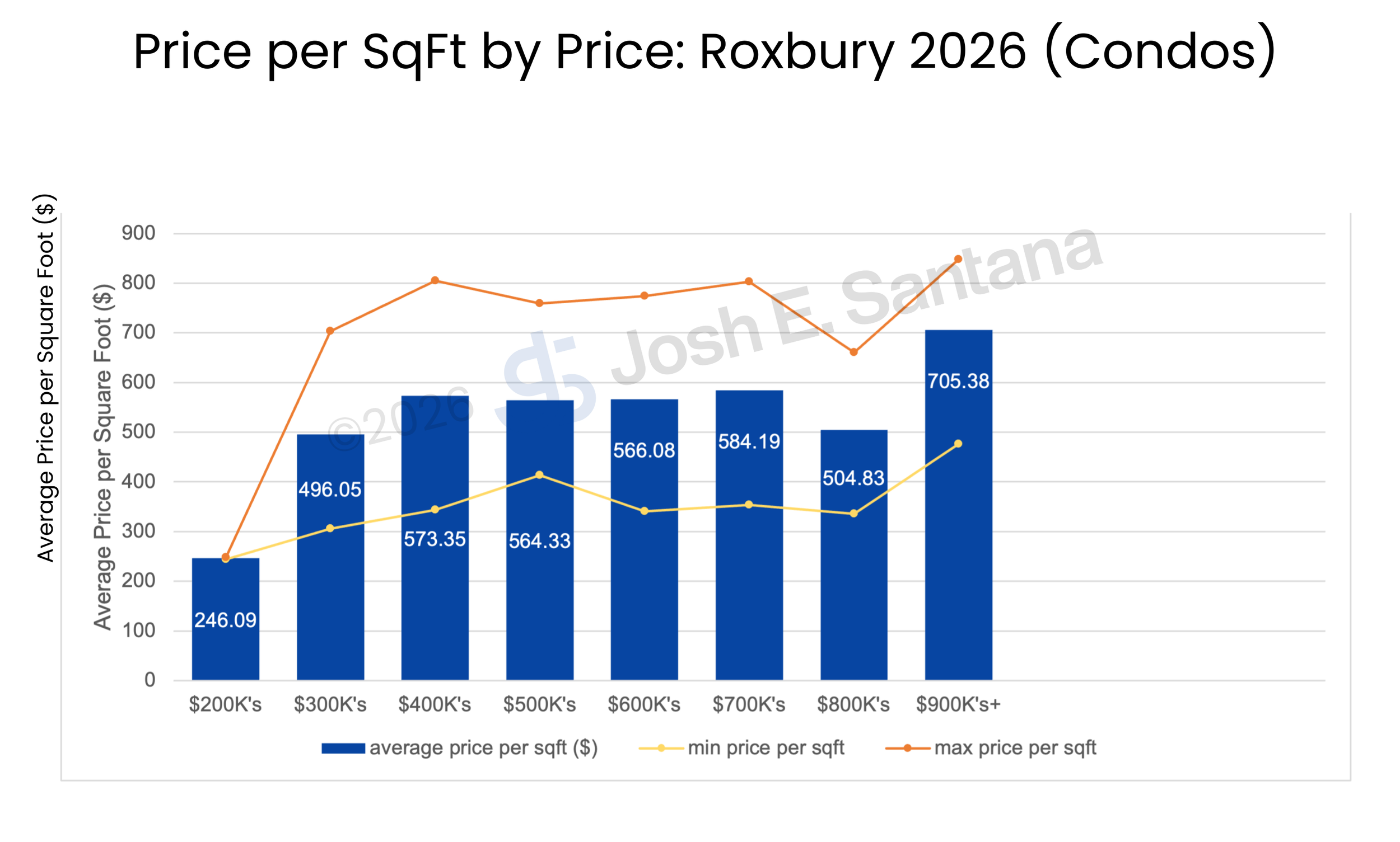 Reviewing the price per SqFt charts shows us the average price per SqFt in Roxbury along with the maximum price per SqFt and the minimum obtained for each price range. In Roxbury, the average price per square foot remains similar through all prices ranges around $500/SqFt with homes in the $900Ks selling for the highest price per square foot.