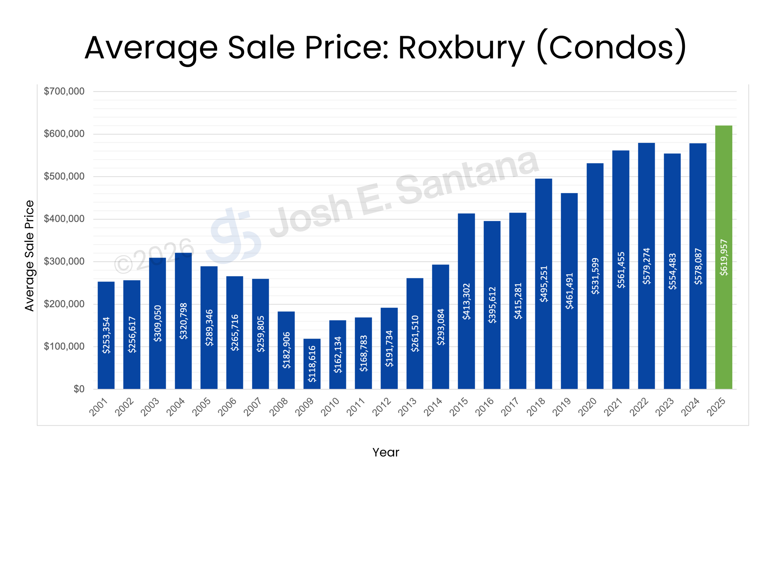 Average prices in Roxbury are well above average prices obtained in the peak of the market in 2004. Average condo prices have been on an upward trend since 2010. Roxbury saw price dips in 2016, 2019, and 2023. During 2020, there was a large increase despite concerns over a potential economic downturn in the future and migration away from the city. COVID-19 and the resultant skyrocketing buyer demand have meant that average prices increased steeply since 2020. We saw a decrease in 2023 and prices have been increasing steadily since then.