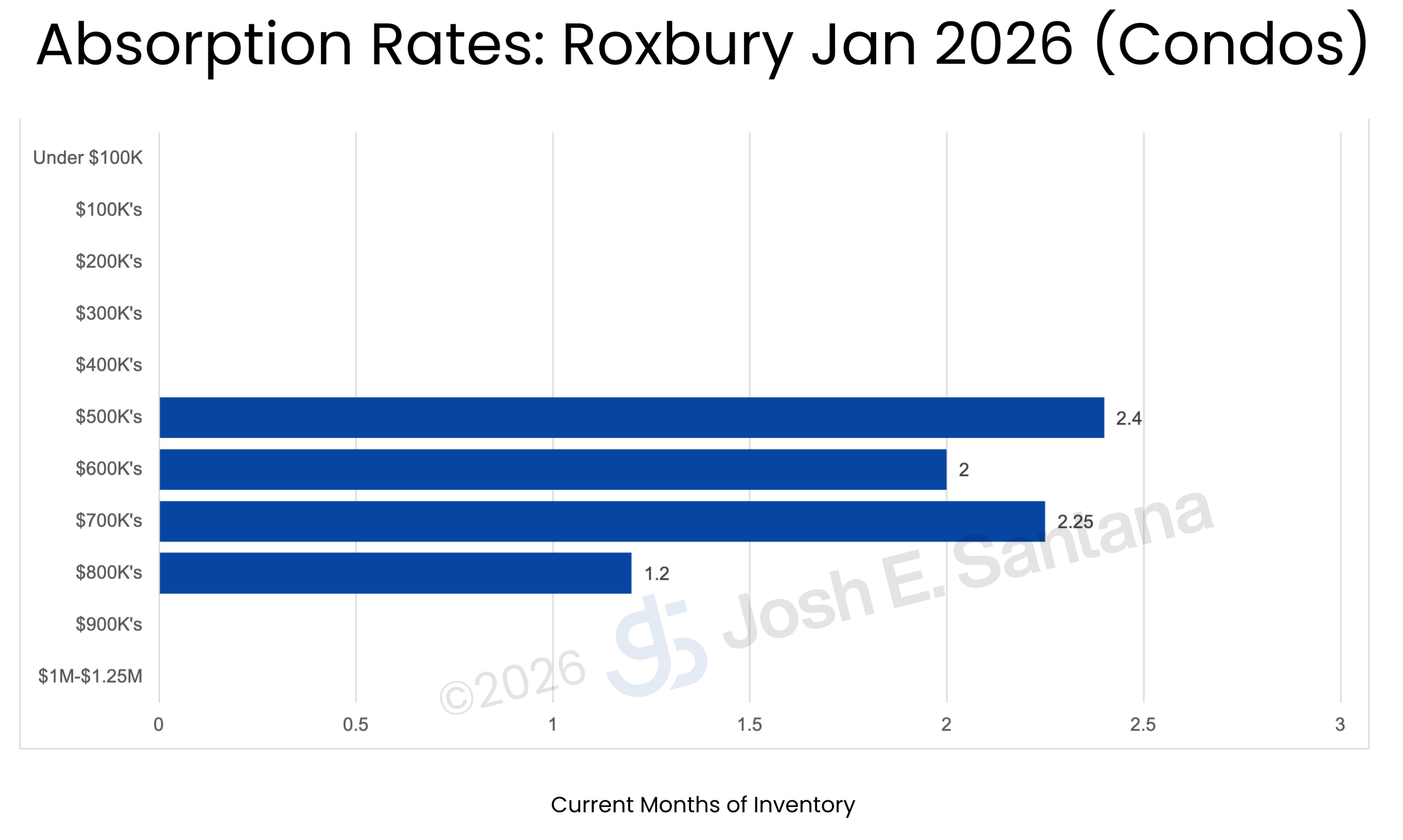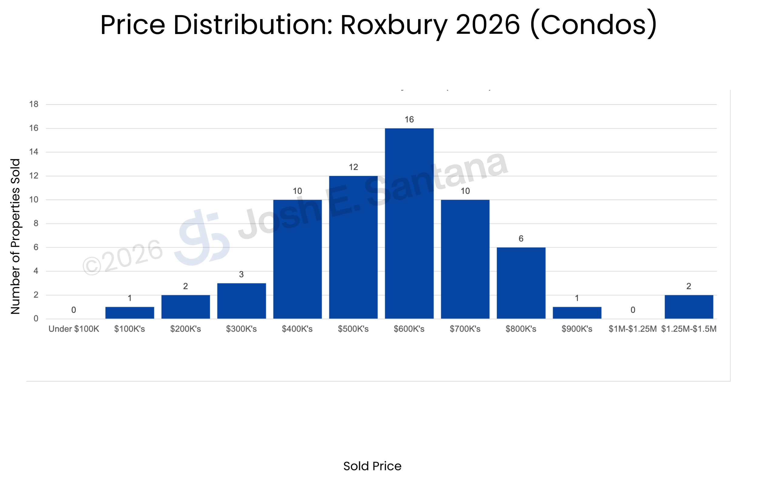 Sales distribution statistics show that the $500K and $600K price ranges are the most active for condos in Roxbury.